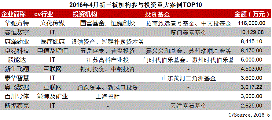 表1 2016年4月新三板机构参与投资重大案例TOP10