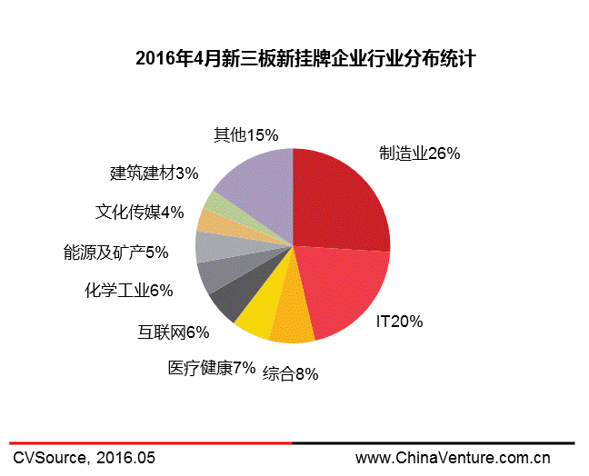 根据全国中小企业股份转让系统披露以及投中信息旗下数据产品CVSource统计,2016年4月新三板新增挂牌企业从行业分布来看,制造业以155家持续领跑,IT以121家位列第二,合计占新三板挂牌企业46%(见图3)。但是相比之下IT行业在新三板市场上更为活跃。