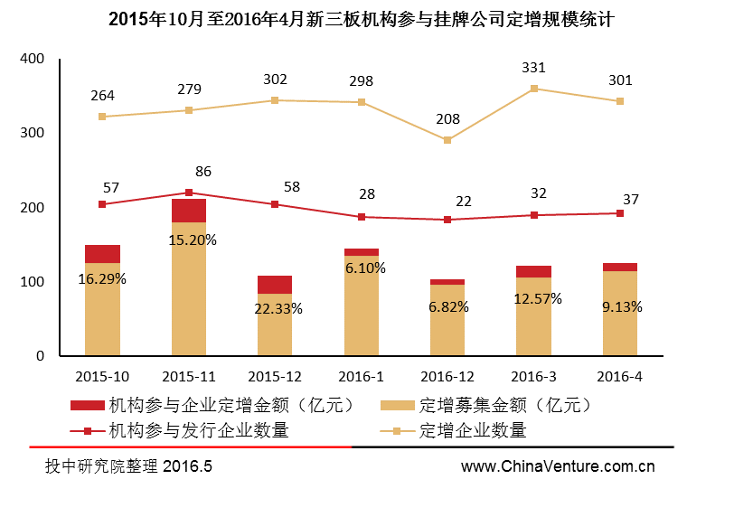 图5 2015年10月至2016年4月新三板机构参与挂牌公司定增规模统计
