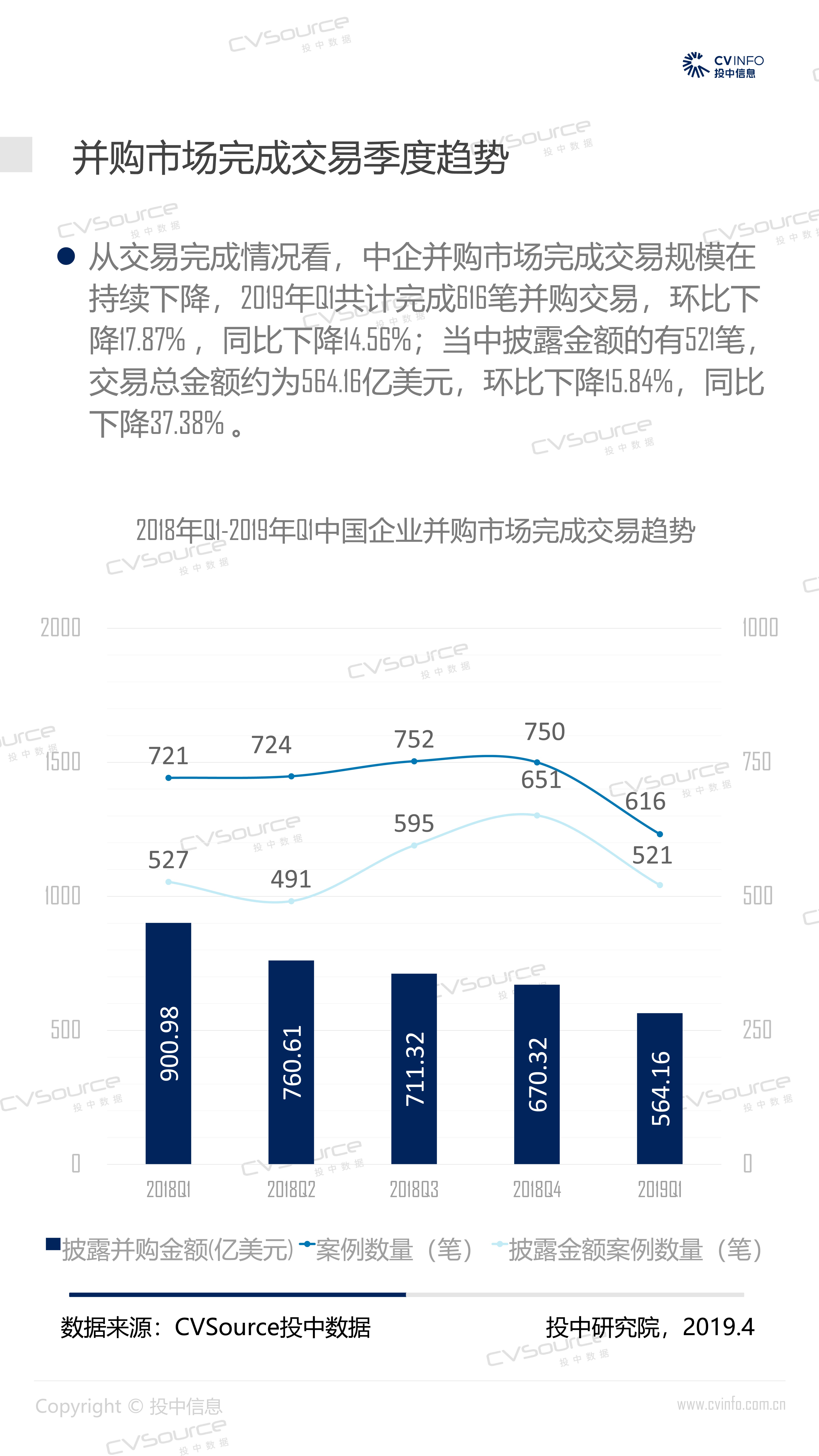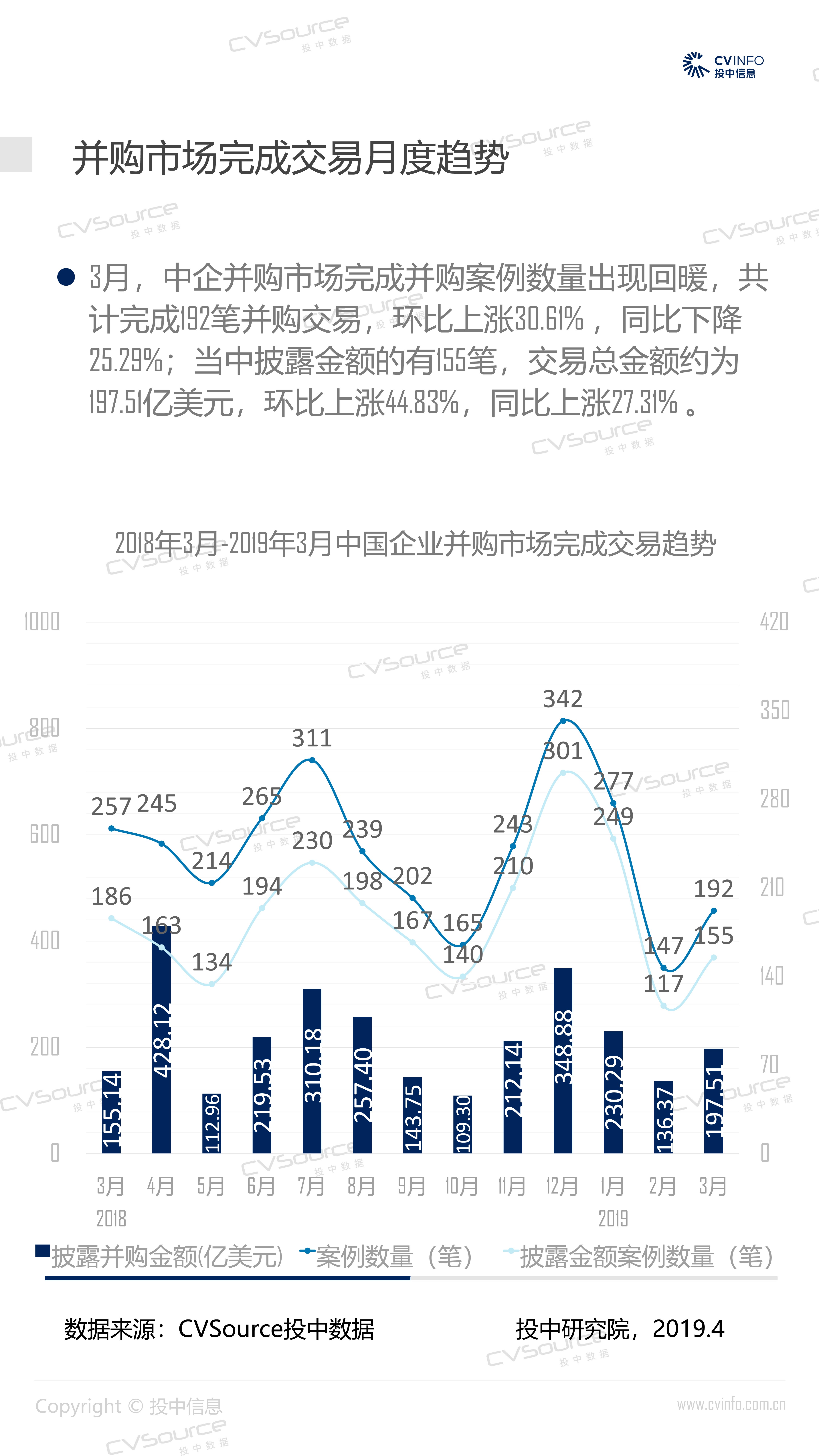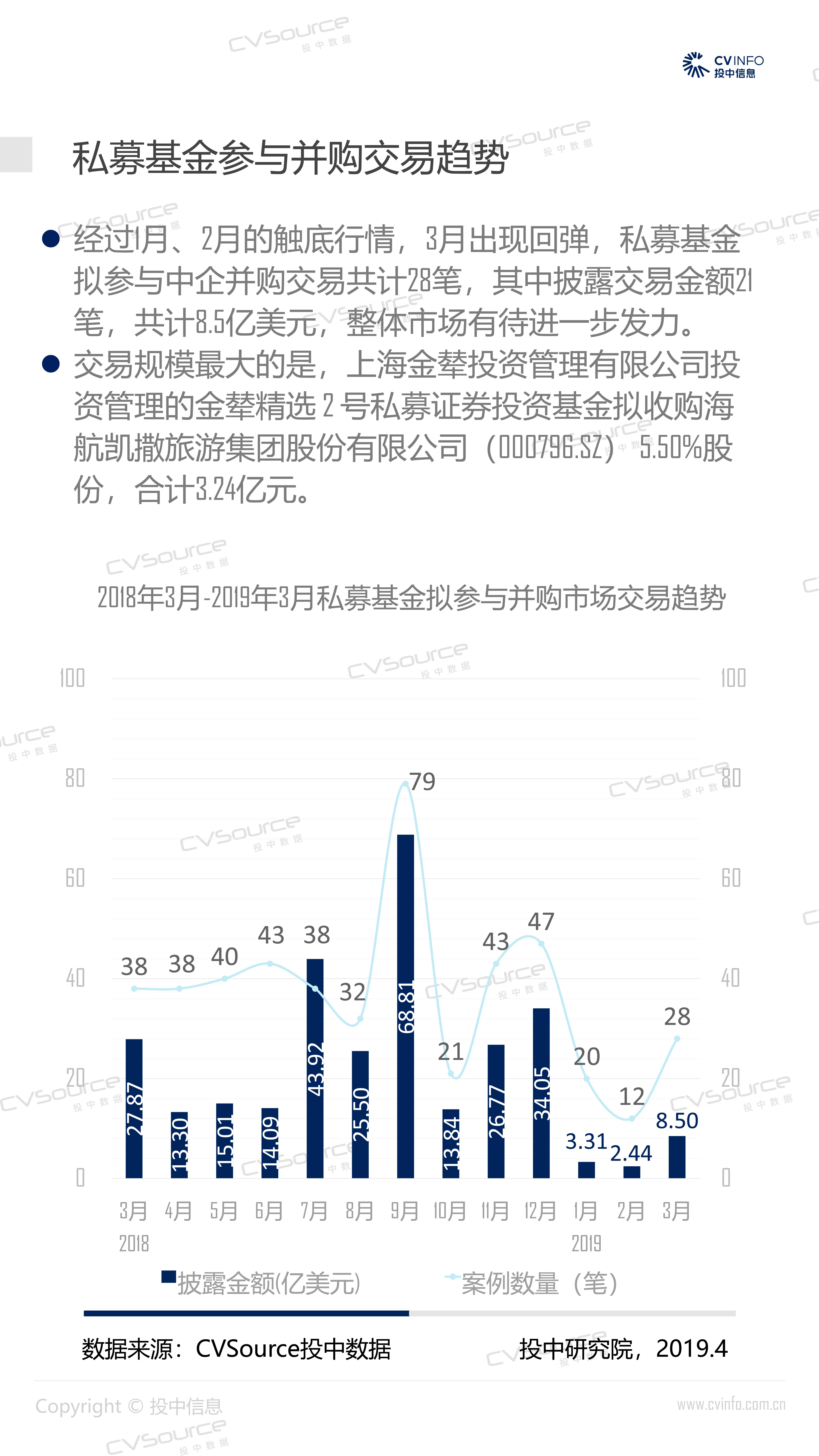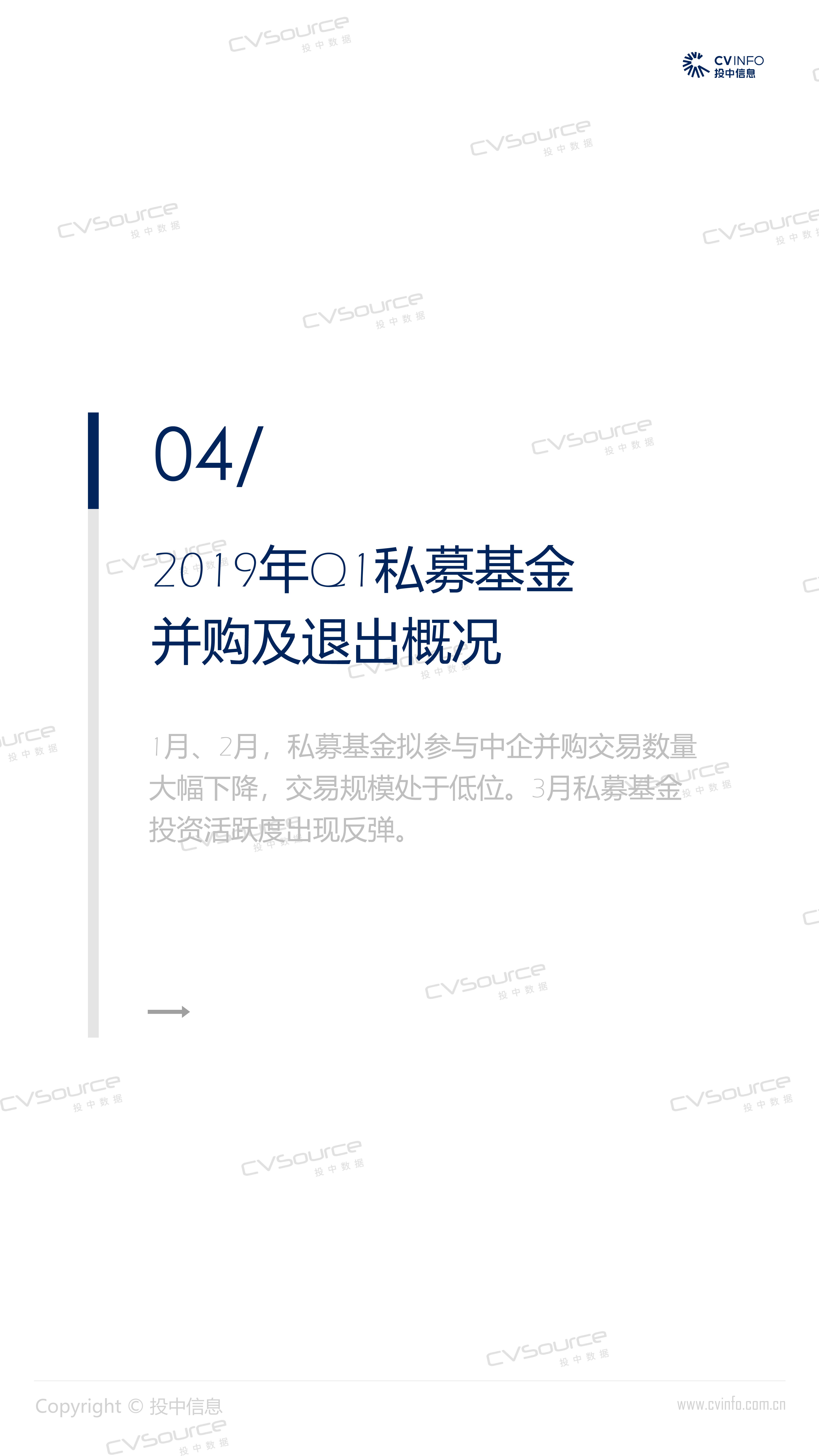 2019Q1,中企并购市场投资意向发展平缓,交易数量缓慢下降,整体交易规模也处于近一年较低水平,3月,私募基金经历过投资观望期,投资规模呈现上扬趋势。