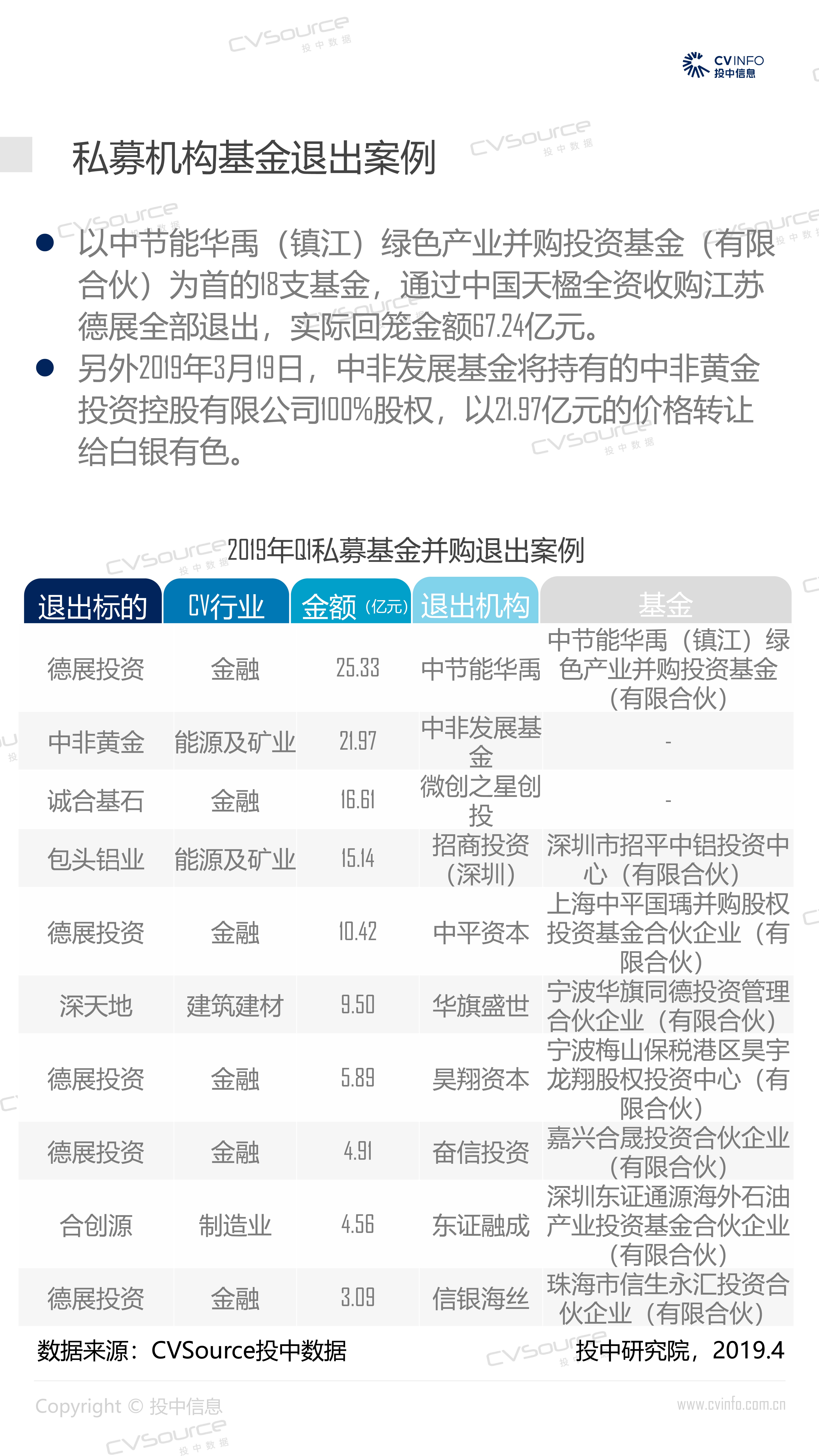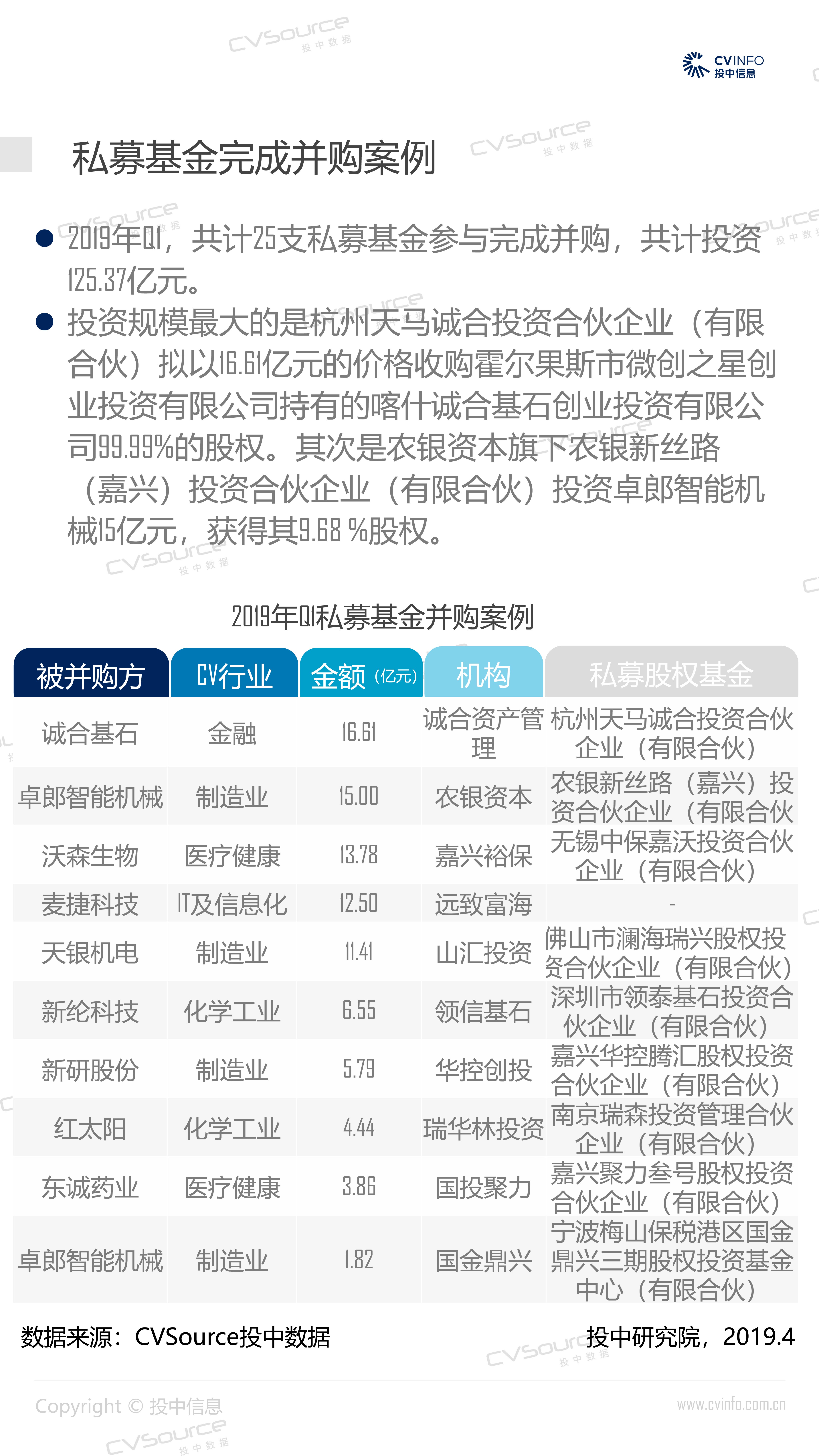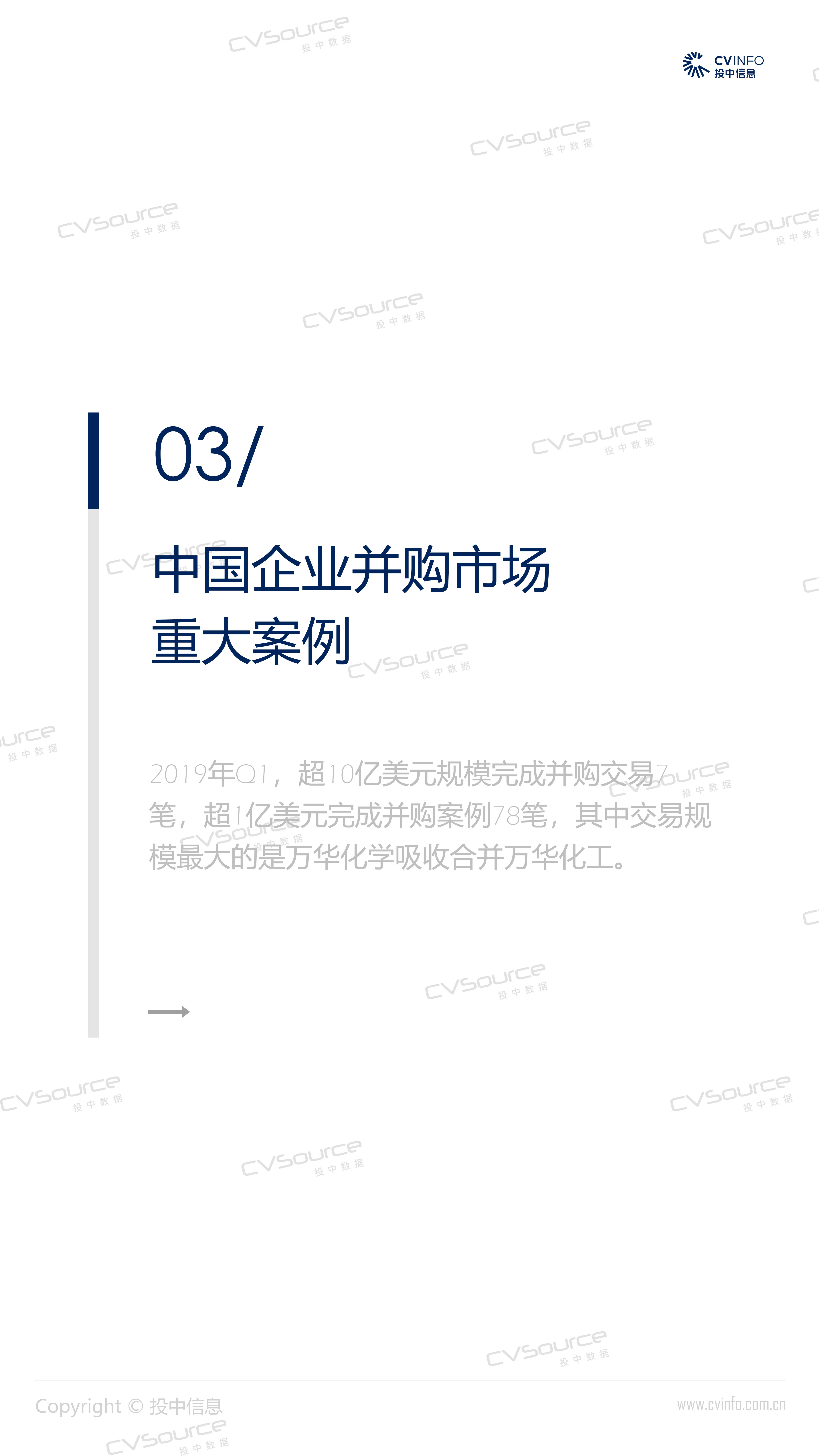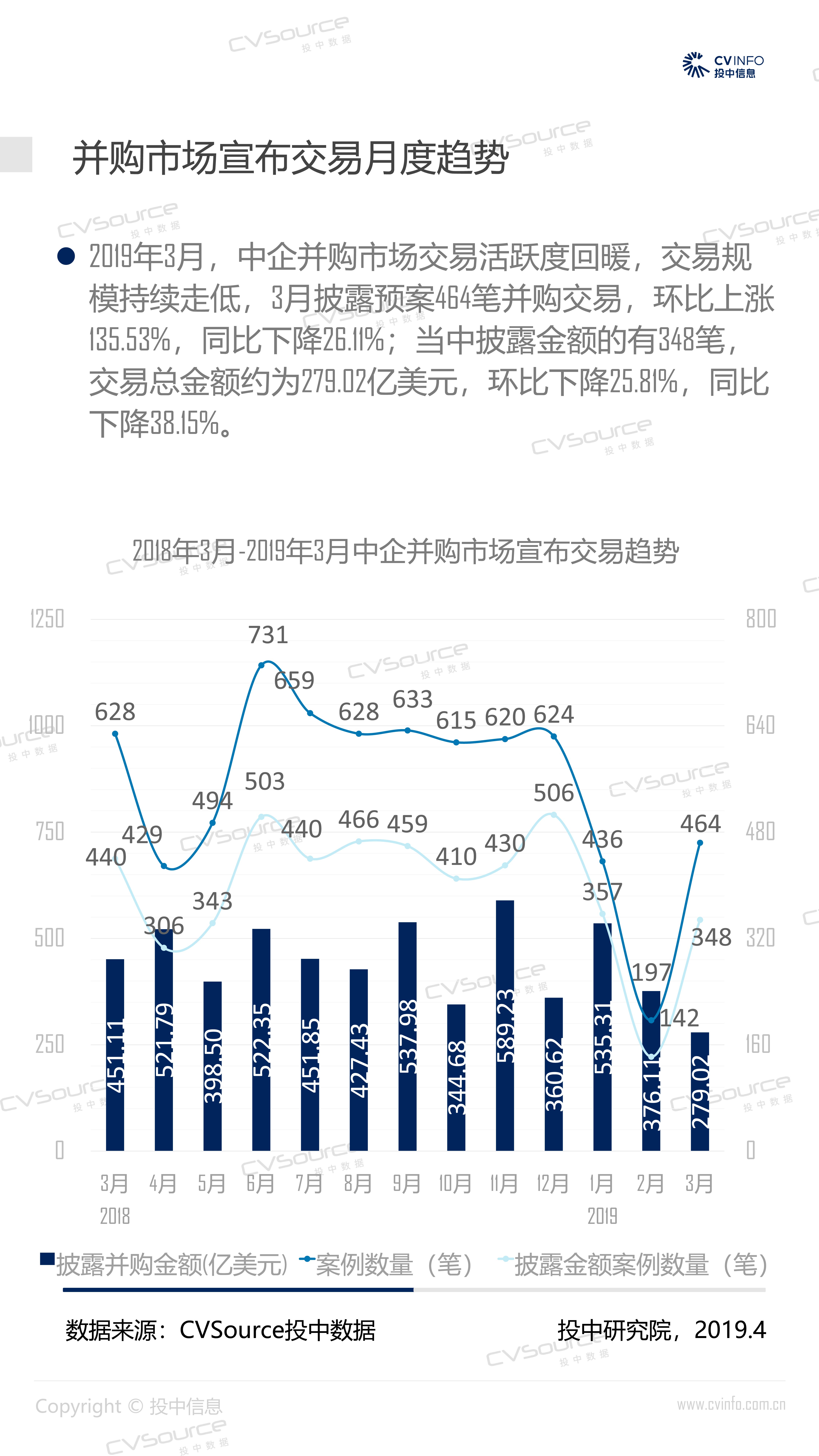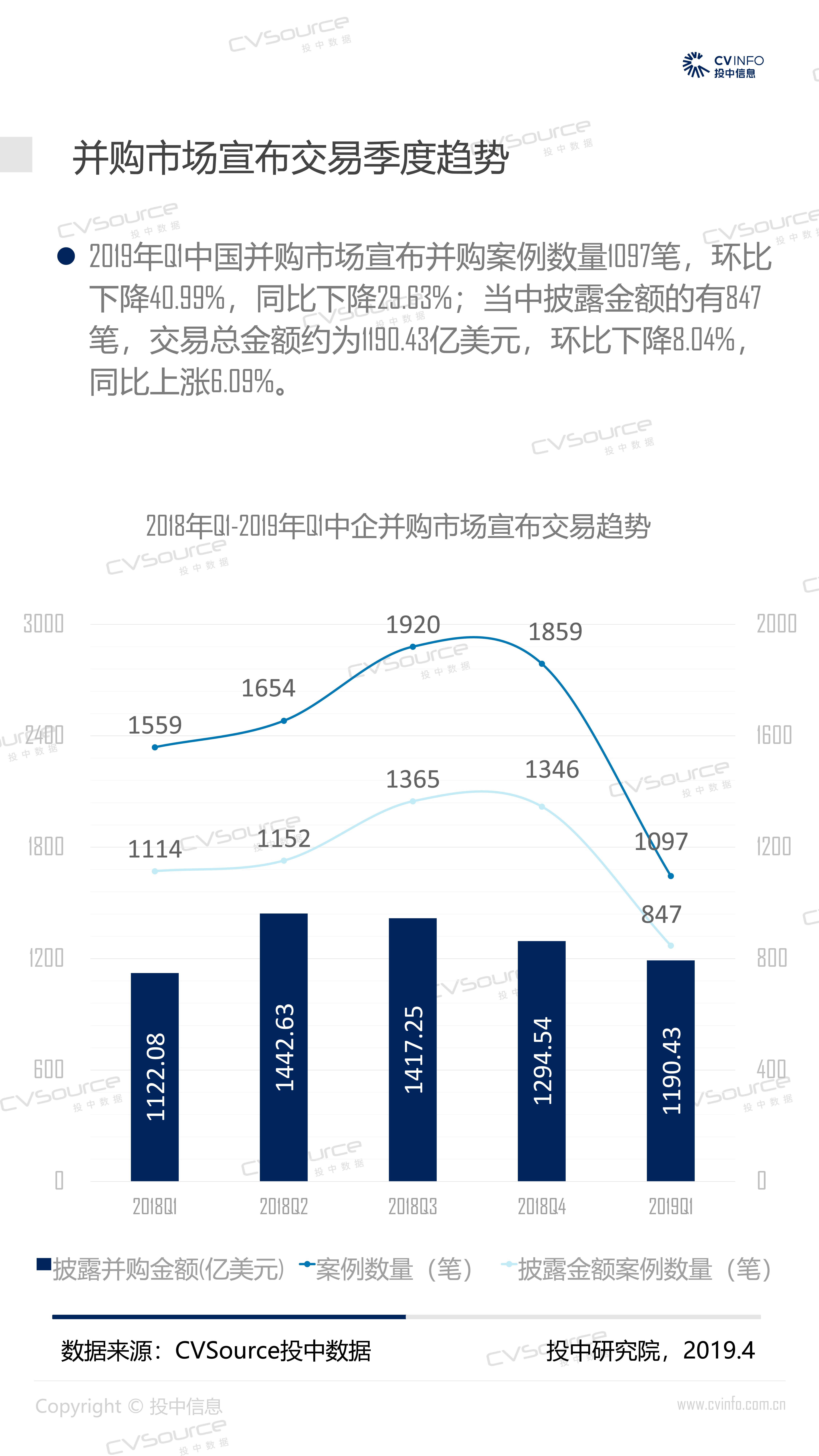 2019Q1,中企并购市场投资意向发展平缓,交易数量缓慢下降,整体交易规模也处于近一年较低水平,3月,私募基金经历过投资观望期,投资规模呈现上扬趋势。