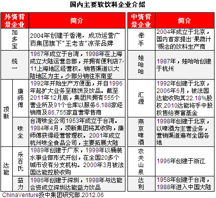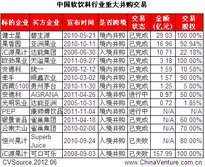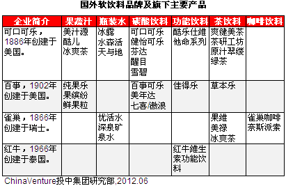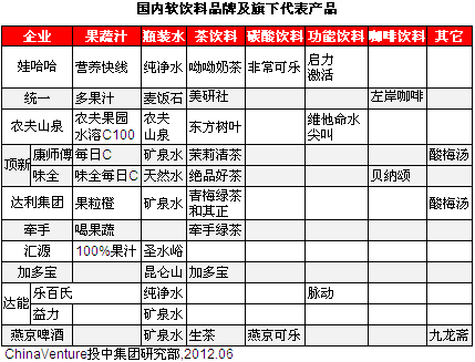 ChinaVenture投中集团分析认为,近年来,在国内健康理念及我国茶文化影响下,碳酸饮料市场份额面临被挤占,“低糖”“无糖”理念的果蔬汁、即饮茶饮料领域企业投资价值凸显;同时,来自航空、铁路运营,大型酒店会议等对高端瓶装水的持续大量需求促使该领域具备较大发展空间,PE机构可以适度关注。目前国内各大饮料品牌已将渠道基本铺至全国主要城市,因此对县级城市以及农村市场的渠道铺设,将成为软饮料企业的下一块蛋糕。