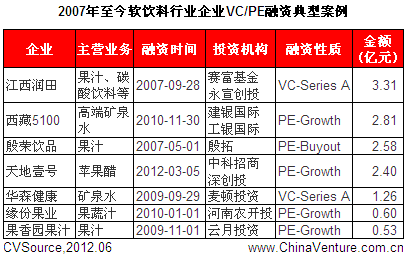 表6 2007年至今饮料行业企业VC/PE融资典型案例