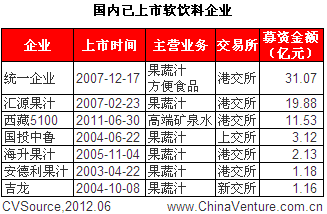 截至2012年6月,国内软饮料行业仅有统一企业、汇源果汁、西藏5100、国投中鲁、海升果汁、安得利果汁、吉龙7家企业登陆资本市场,其中6家企业主营业务均涉及果蔬汁制作及销售,仅有国投中鲁在A股上市,其余均赴港交所上市(见表7)。截至6月14日证监会披露的A股拟上市企业名单中,没有软饮料企业排队等候上市。