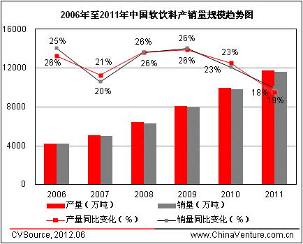 图1 2006年至2011年中国软饮料产销量规模趋势图
