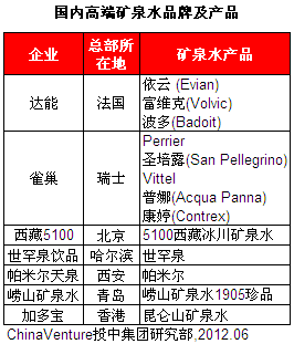 依据瓶装水价格差异,通常将单瓶500ml销售价格高于5元的瓶装水定义为高端瓶装水,反之为大众市场瓶装水。高端瓶装水拥有较好的品牌形象,目前市场参与者较少、集中度相对较高,份额主要集中在依云(Evian)、富维克(Volvic)、Perrier、圣培露(SanPellegrino)、5100西藏冰川矿泉水、帕米尔、崂山手中,主要客户群体为铁路运营商、航空公司、商业银行、大型酒店、政府机构等,这些客户群体对高端瓶装水不但具备大量可持续性需求,并且具有较强购买实力,将会带动我国高端瓶装水行业快速发展(见表2)。