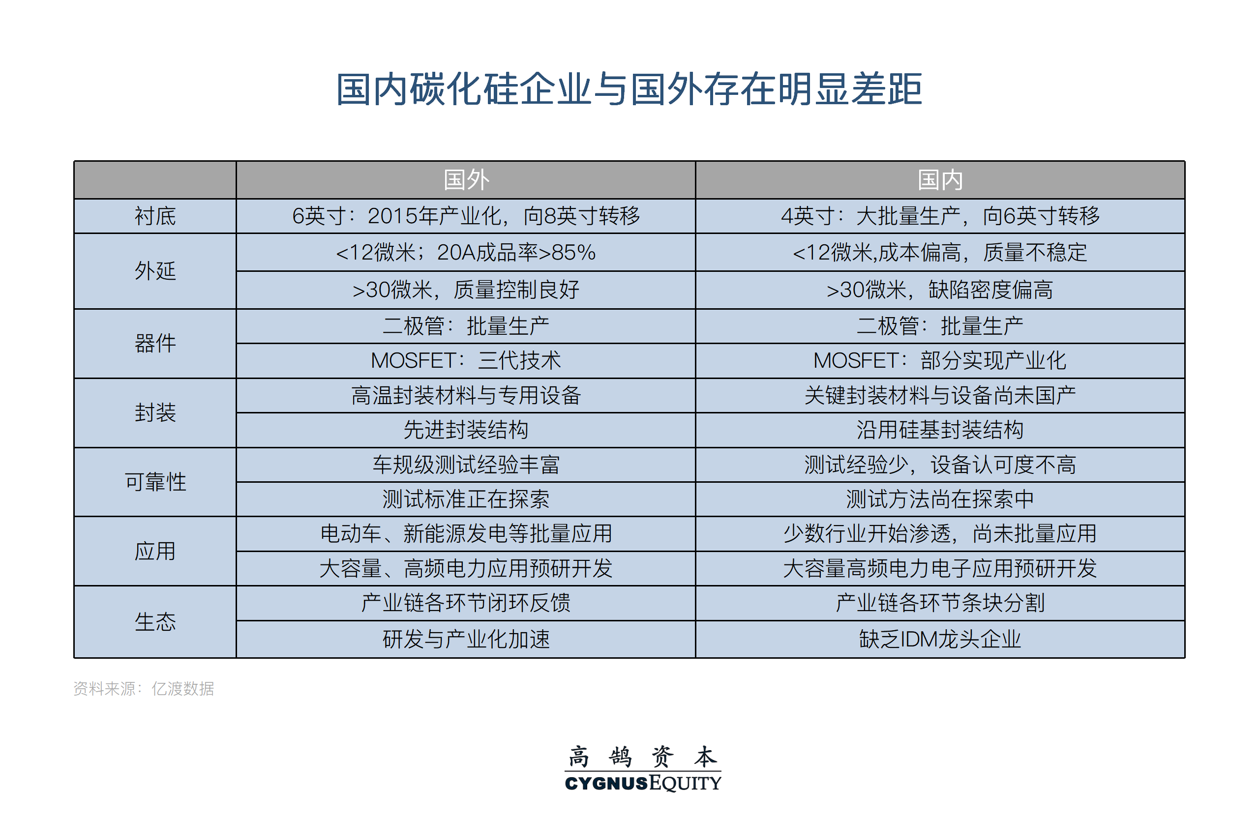 我国和国外企业相比,在衬底、外延、器件设计及制造、封装等领域均有一定差距,直接导致了我国碳化硅的生态明显弱于国外。