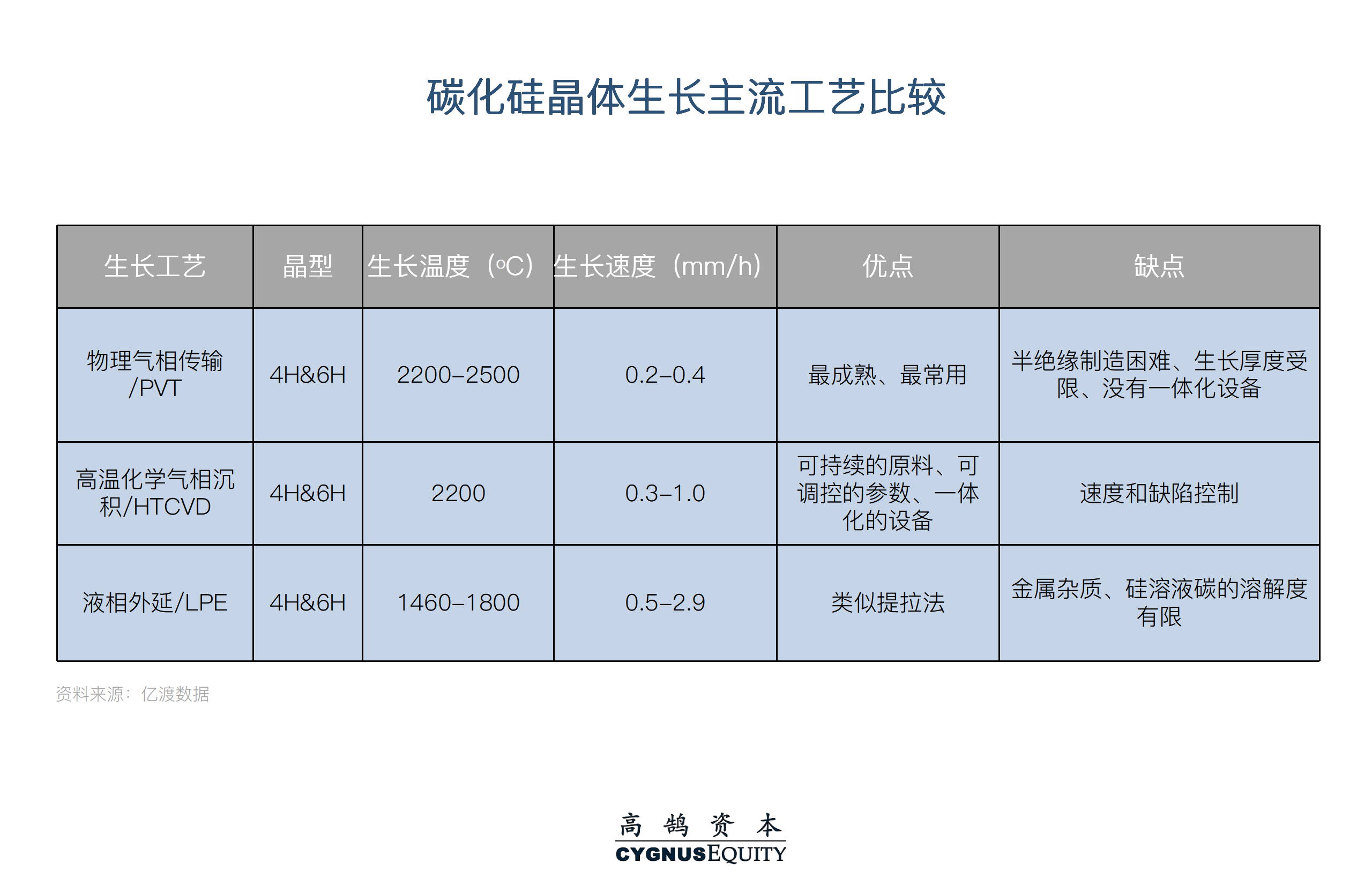 目前商业化最成熟的还是物理气相传输法,也是实现产业化大规模生产的方法。其优点是设备成本低、结构简单、技术成熟度和耗材成本相对较低,缺点是原料不能连续供给、生长厚度有限、缺陷密度高。