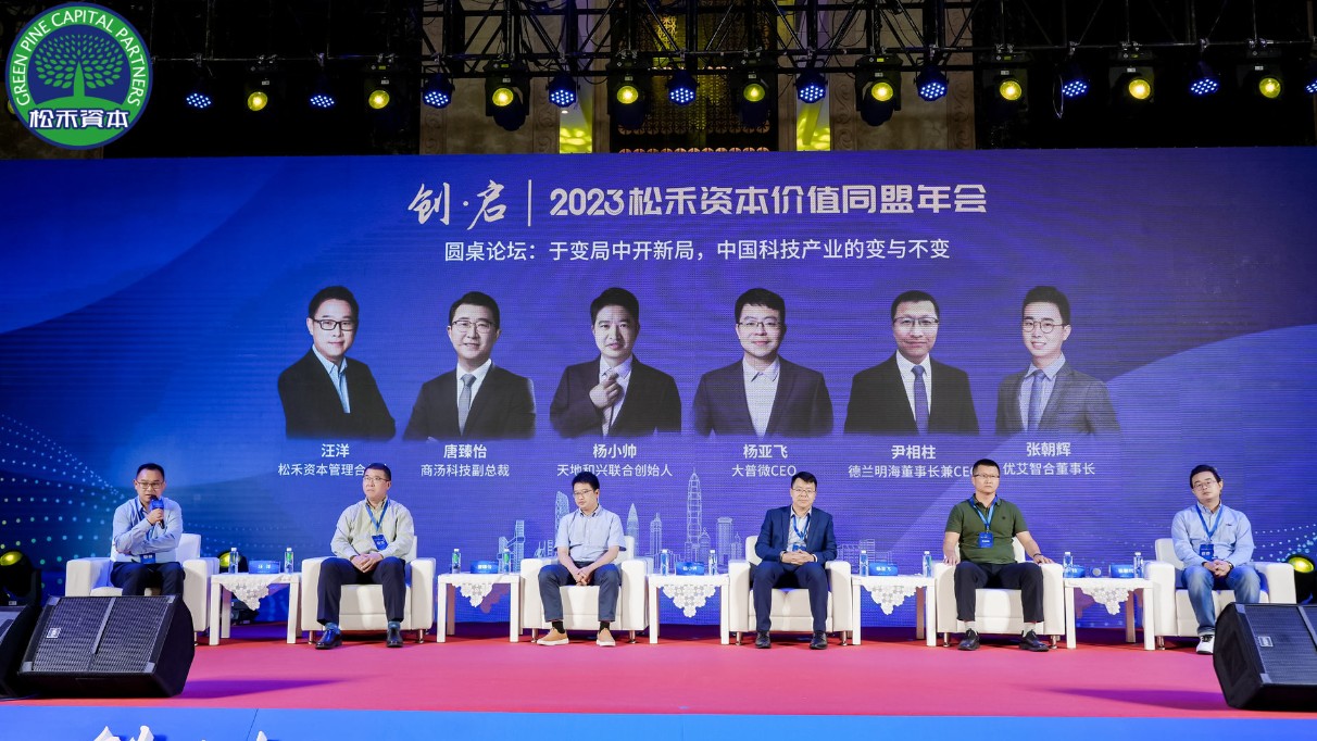 在科技主题的圆桌论坛中,主持人松禾资本管理合伙人汪洋与来自商汤科技副总裁唐臻怡、天地和兴联合创始人杨小帅、大普微CEO杨亚飞、德兰明海董事长兼CEO尹相柱、优艾智合董事长张朝辉以“于变局中开新局,中国科技产业的变与不变”为主题展开了热烈的讨论。