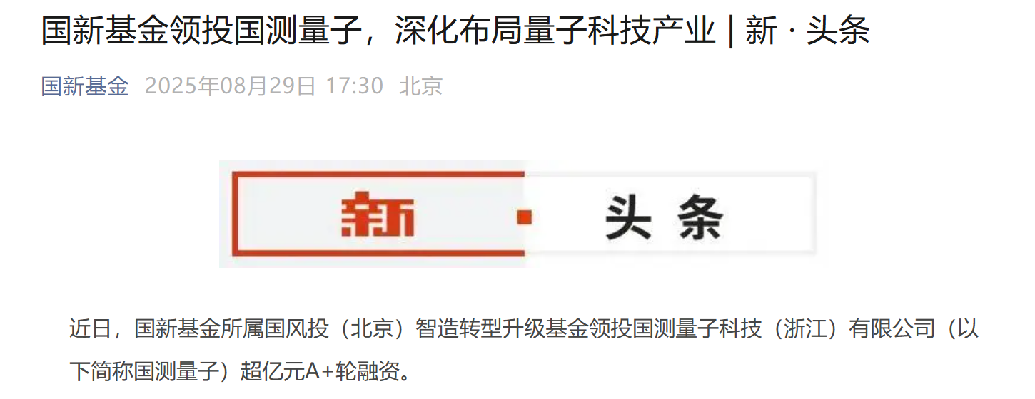 8月29日,国新基金公众号发布国新基金领投国测量子科技(浙江)有限公司(简称“国测量子”)超亿元,深化布局量子科技产业的信息。同日,常州金控集团宣布旗下自管市场化基金完成对国测量子A+轮的股权投资,表明这是国测量子继2025年初完成A轮融资之后关闭的第二轮融资,两轮融资金额达数亿元,为国测量子在量子精密测量领域构建大规模的全国产化生产能力提供了重要支撑。