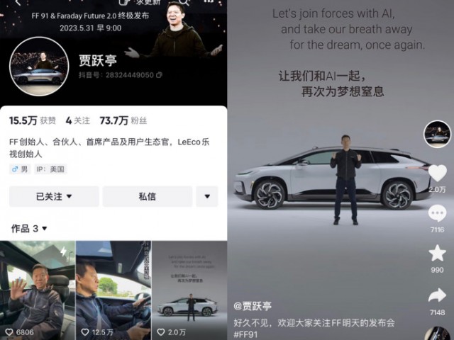 贾跃亭在直播中着重谈到了FF91这几年大量的升级迭代,甚至换代。他希望“我们和AI一起,再次为梦想窒息”。截至发稿,贾跃亭在抖音共发布了3条视频,均是关于FF91,获得超20万个赞。