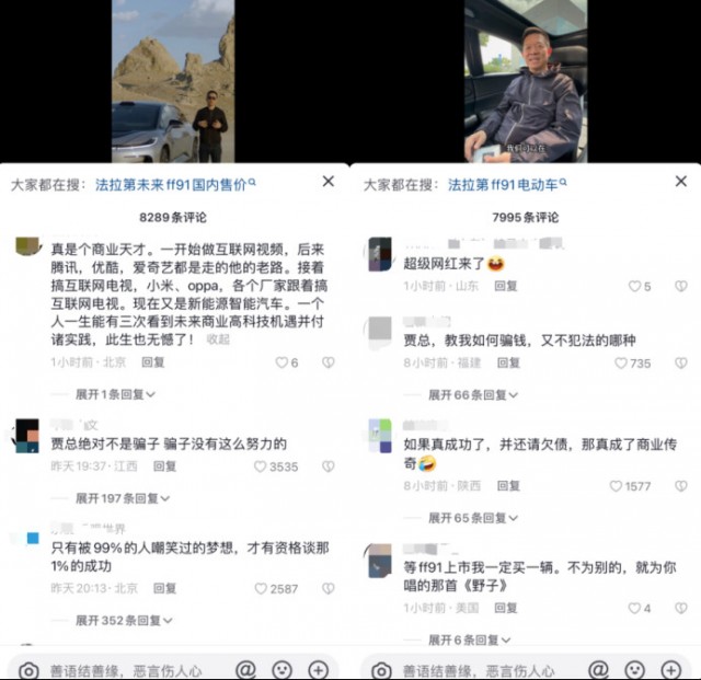 很多网友对贾跃亭在造车上的坚持给予肯定,为他“加油”,认为他“能完成绝地反击”、“会成为传奇”,还有网友表示“贾总绝对不是骗子,骗子没有这么努力的”,甚至愿意“为梦想窒息,蒙眼前行”。