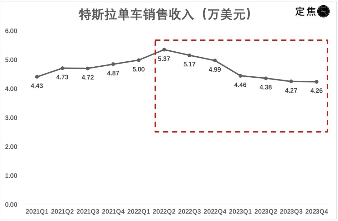 2022年,特斯拉的单车销售收入是5.1万美元,2023年只有4.3万美元,降幅达15%。在2022年二季度达到5.37万美元的高点后,连续降了六个季度,现在不到4.26万美元 (约30万元人民币) ,史上最低。