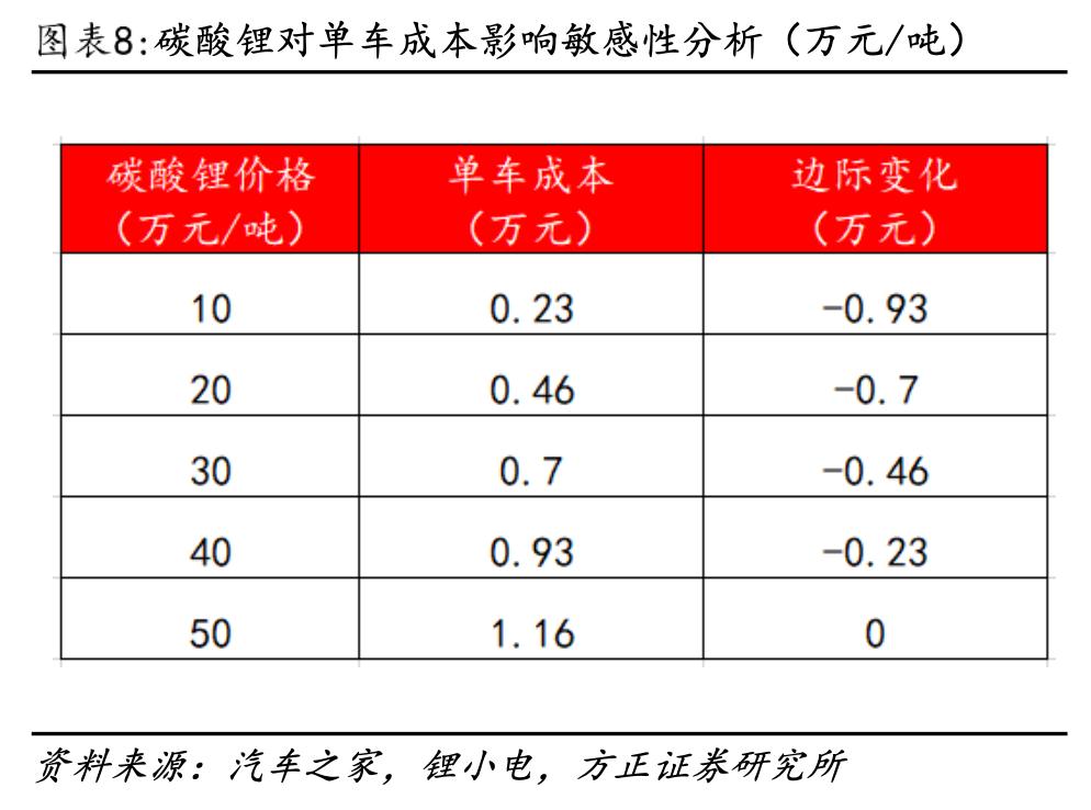 方正证券做过一个测算,以比亚迪海豹车型标准版为例,当碳酸锂价格由50万元/吨下降至10万元/吨,单车将释放0.93万元成本空间。