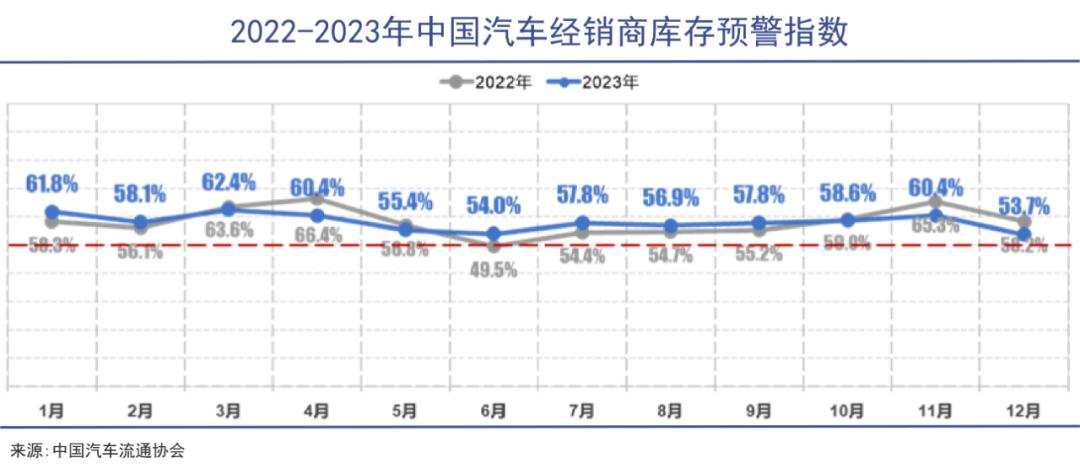 中国汽车经销商库存预警指数在2023年末短暂下行后,到今年1月又重新回到59.9%的历史高位,环比上升6.8个百分点。