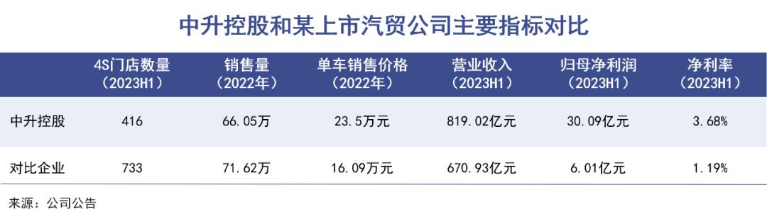这样的战略打法导致业绩千差万别,两者净利率差了近两倍,中升控股也用更少的门店数量和销售量,创造了5倍于友商的净利润。