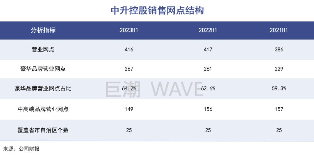 截至2023年上半年,该汽贸经销网点共计733家,远高于中升的416家,在2022年卖出了71.62万辆新车,中升售出66.05万辆。但豪华品牌经销店数量上,该公司有231家,占比仅31.51%, 而中升有267家占比64.2%。