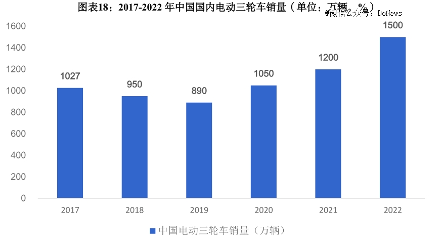 熟悉的声音从国内农村响彻高线城市后,国内电动三轮车销量从2019年的890万辆增长到2022年的1500万辆。