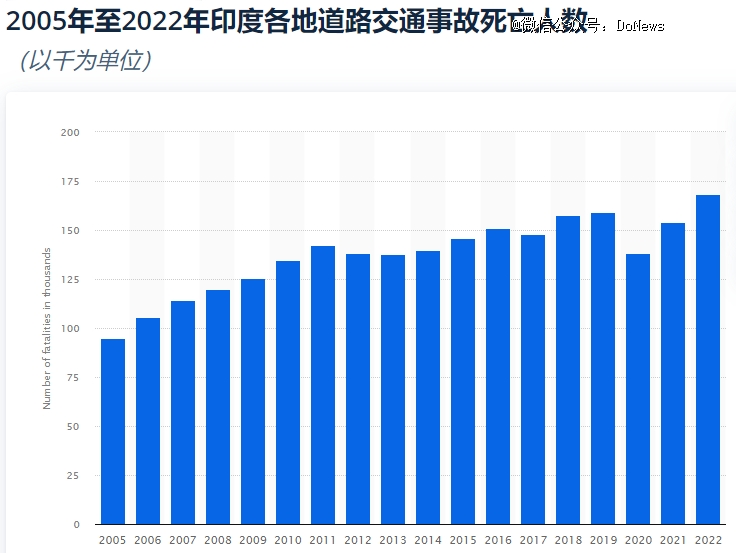 Statistic数据显示,2022年印度全国道路交通事故数量约为46.1万起,每年该国约3%至5%的GDP用于道路交通事故,大约70%的事故涉及年轻的印度人。