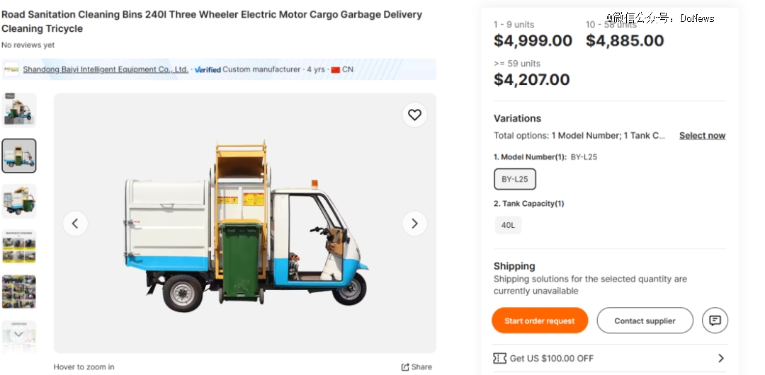 不仅仅是消费端国产电动三轮车价格飙涨,企业端产品同样存在这一情况。如在阿里国际站上,部分国产垃圾清运电动三轮车售价直接拉到4027美元至4999美元。在全球消费市场K型分化以及企业追求降本增效背景下,国产三轮车海外过高的售价很容易劝退海外消费者。