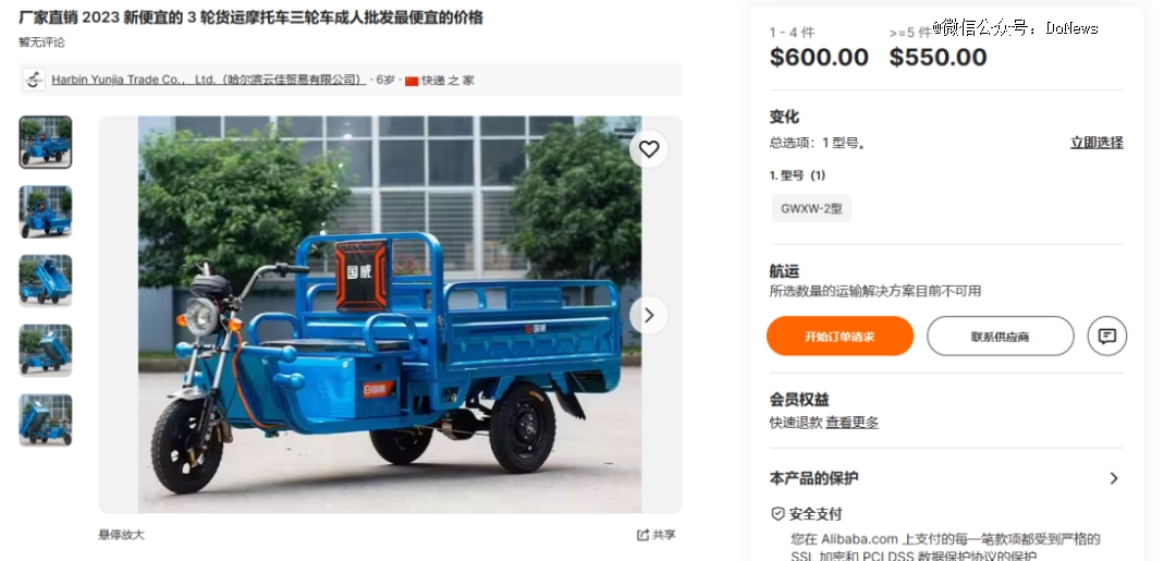 当然部分国产品牌三轮电动车的出海价格,在海外市场上也的确有很强的价格竞争力。如阿里国际站上,国威出口到法国的电动三轮车价格为550欧元到600欧元,而目前法国电动三轮车的价格在几千欧元至1万欧元。