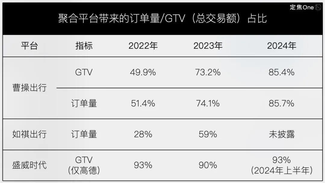 最典型的是曹操出行,2022年,它的总GTV(交易总额)为89亿元,其中49.9%(约44亿元)来自聚合平台,自有渠道贡献剩余50.1%(约45亿元);到了2024年,总GTV增加到170亿元,但85.4%来自聚合平台(约145亿元),自有渠道占比为14.6%(约25亿元)。