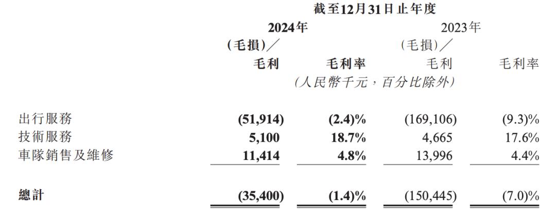 反观如祺,2024年净亏5.64亿,未来还需要长期投入。从毛利情况看,技术服务和车队销售虽盈利(毛利率分别为18.7%、4.8%),但收入规模太小(合计2.6亿);收入占比9成的网约车毛利率为-2.4%,拖累了整体利润。