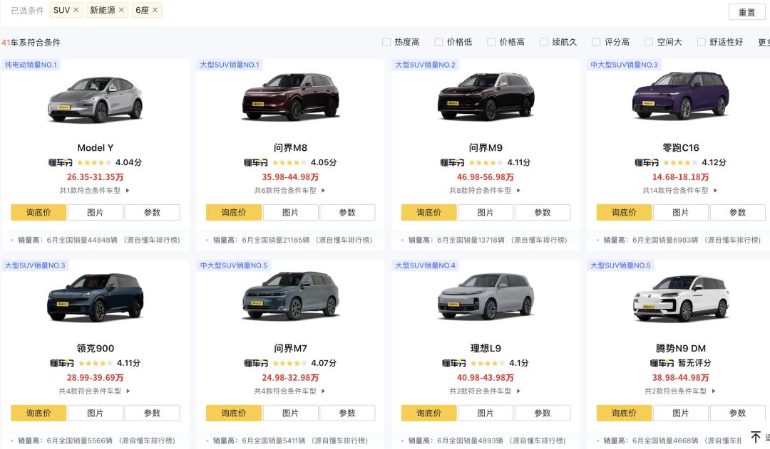 懂车帝统计的6座新能源SUV销量排名