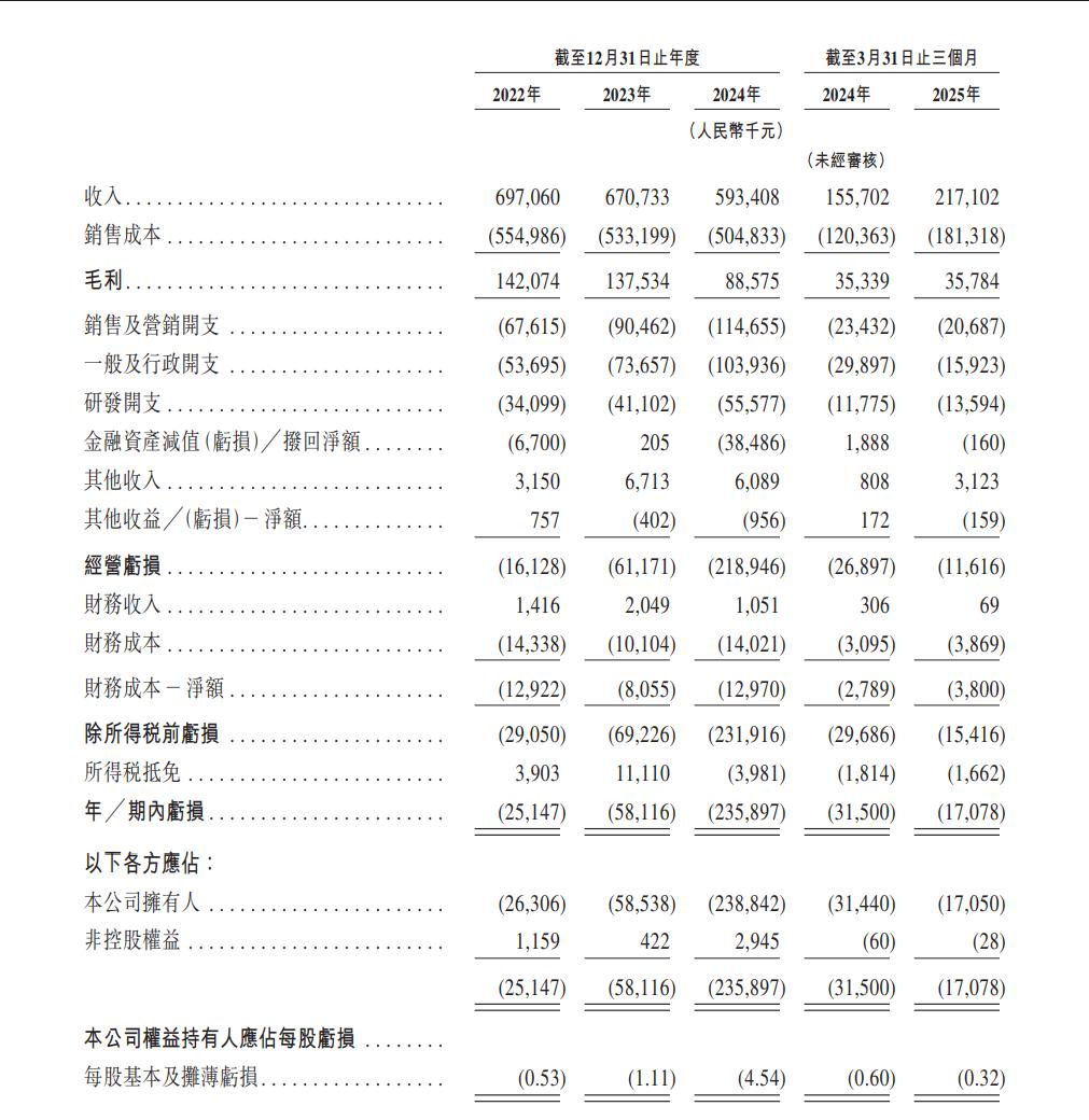综合多份招股书,2021-2024年及今年前三个月,挚达科技的收入分别约3.58亿、6.97亿、6.71亿、5.93亿、2.17亿元;毛利分别约9430.8万、1.42亿、1.38亿、8857.5万、3578.4万元,毛利率分别为26.3%、20.4%、20.5%、14.9%、16.5%;净亏损分别约2332.2万、2514.7万、5811.6万、2.36亿、1707.8万元。