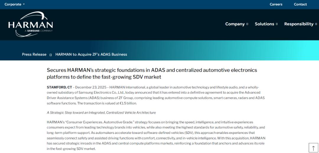 而新近的这笔收购对于三星而言,可以补上其汽车智能化业务的最后一块拼图,要知道哈曼国际已经在音响、信息娱乐、车联网等领域都有所布局,唯独缺少车辆外部感知能力,采埃孚的ADAS技术正好补上这一环。