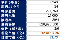 根据国家癌症中心发布的数据,我国淋巴瘤发病率为4.18/10万人,其中非霍奇金淋巴瘤占比90%,非霍奇金淋巴瘤中的外周T细胞淋巴瘤占淋巴瘤的25-30%,据此估算我国外周T细胞淋巴瘤每年新增人数为1.31-1.57万人,取1.4万进行计算。按照峰值销售倍数法进行估值,一般的,给予新药研发行业2-6的倍数值,则理论市值应该在12亿到37亿之间(如下图所示),而目前定价的市值接近84亿,即使按照最高市值37.26亿进行计算,多出来的46亿多市值都是建立在公司药物能够成功获批上市,且销售符合预期的假设上。