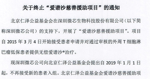 根据财报数据,2019年一季度,微芯生物营业收入2540.78万元,同比下降17.77%。而记者发现了一则北京仁泽公益基金会的通知,通知显示,自2019年1月1日期,不再进行爱谱沙(即西达本胺)的赠药。而根据披露的消息,微芯生物的销售中一部分是来自于公益项目。而公益项目到底占总销量的多少呢?记者未能查到相关数据。