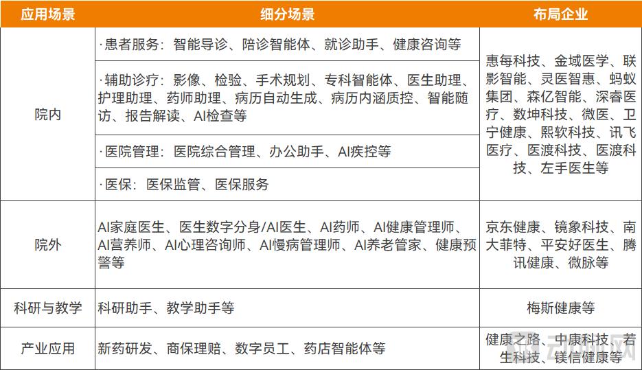 医疗智能体主要应用场景及布局企业,资料来源:公开信息、访谈(表格为不完全统计,部分企业布局多种应用场景,未重复统计)