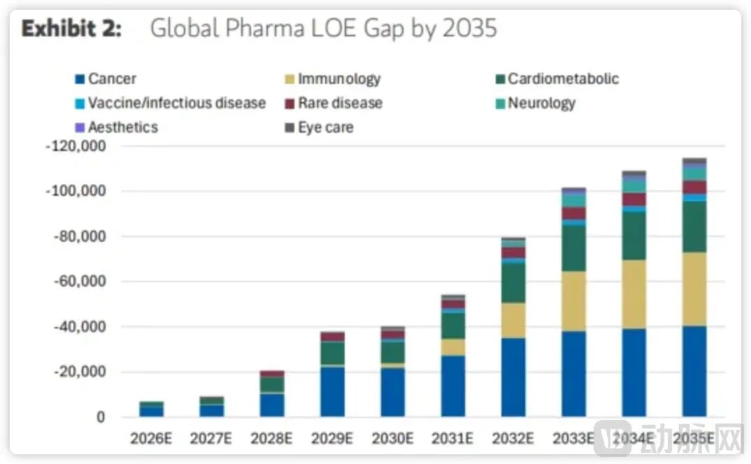 据摩根士丹利测算,截至2035年,MNC(主要是美国和欧洲药企)将因专利到期损失约1150亿美元收入,其中2030年前就有400亿美元的营收缺口。从治疗领域看,肿瘤(400 亿美元)、免疫(330 亿美元)、心血管代谢疾病(230 亿美元)三大领域占比最高,达80%以上,是补位需求最迫切的赛道。
