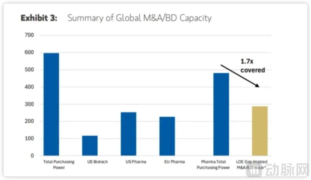 虽然Biotech们可以贡献一定的收入,但考虑到临床失败率和监管不确定性,仍存在显著缺口。MNC预计会投入4800亿美元的并购/BD资金,加上处于商业化阶段创新药企的 1170亿美元,总购买力近6000亿美元,是专利悬崖缺口金额的1.7倍,为今后一段时间的大规模交易提供了充足的资金。