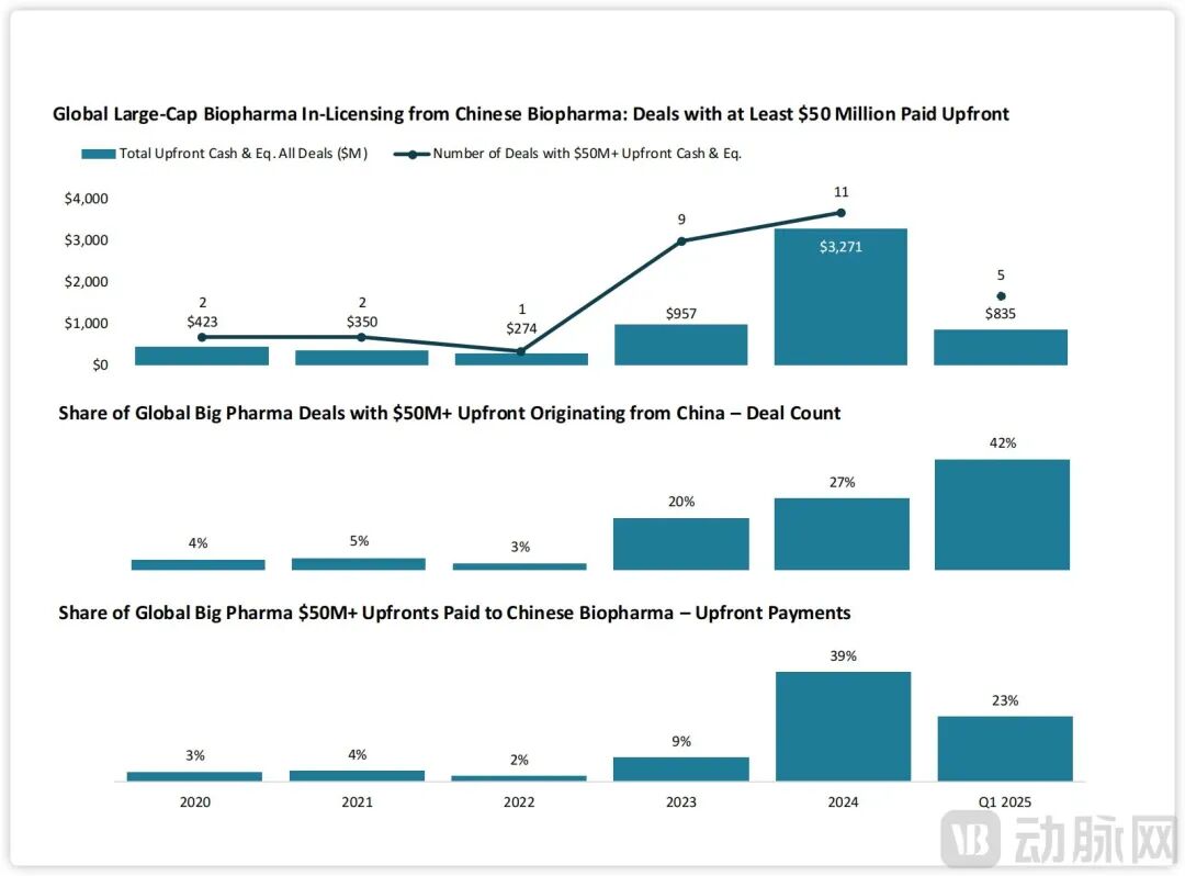 2024年全球药企与中国生物制药公司达成11项授权引进交易,总预付款达33亿美元,其中单笔预付款超5000万美元的交易占27%,预付款总额占比达39%。2025Q1中国市场达成五笔大型生物制药授权引进交易,占全球此类交易总量的42%,占大型交易预付款总额23%。而2023年前,中国市场在制药企业大型授权引进交易中的占比不足其全球交易总量5%。