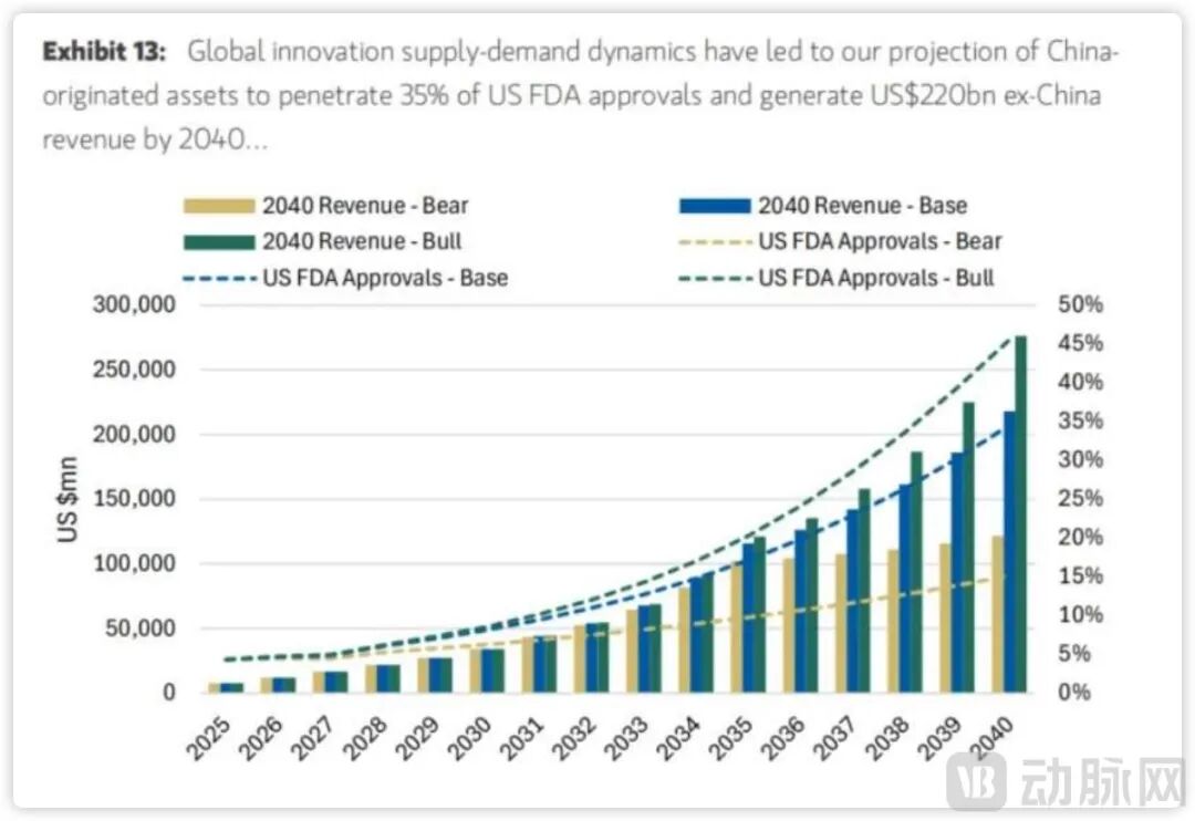 “中国的生物技术发展迅速,已不再仅仅是一个区域性的故事,而是全球新药供给链的下一站。”报告预计2030年中国产药品年收入将达340亿美元,2040年跃升至2200亿美元,美国FDA批准药品中中国占比将从当前的5%飙升至35%。
