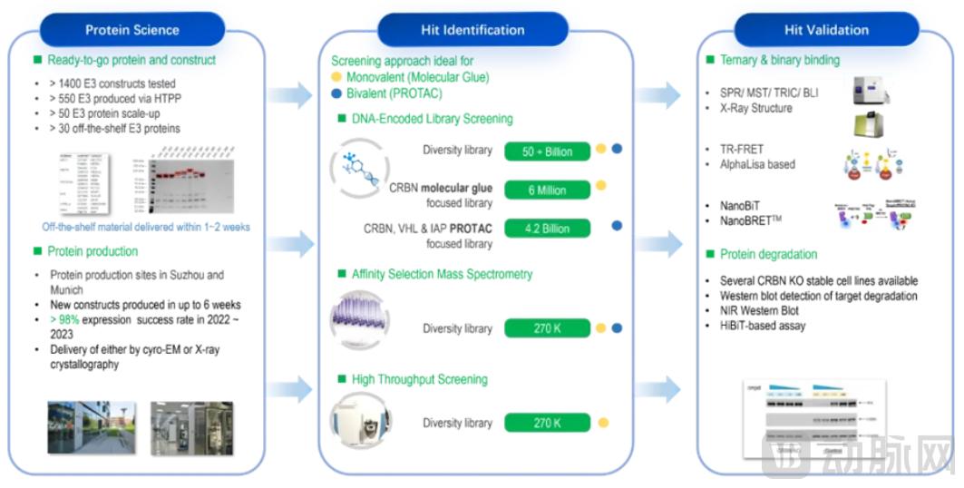 例如,药明康德所构建的多样化DEL库,目前已收纳超过500亿种结构各异的小分子,每个小分子均带有独特的DNA条形码标识,如同化学空间中的独特个体,便于科研人员进行快速识别与深入研究。在探索新型分子胶靶点的过程中,DEL库能够以极低的成本、无偏向性地在这一广袤化学空间中搜索E3-配体-靶蛋白之间的三元关系初始线索,为分子胶的发现拓展了广阔的可能性。