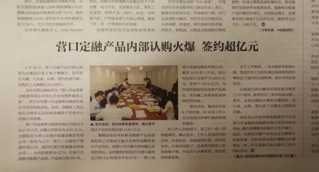 2018年6月,汉能开始向内部员工集资,用于项目经营。汉能在公司内部报纸上写到,6月28日,营口定融产品(营口市金能移动能源有限公司2018年非公开定向债务融资工具)内部认购签约在集团内部总部展开,几天来,现场认购,签约热度不减,汉能员工认购超亿元人民币。