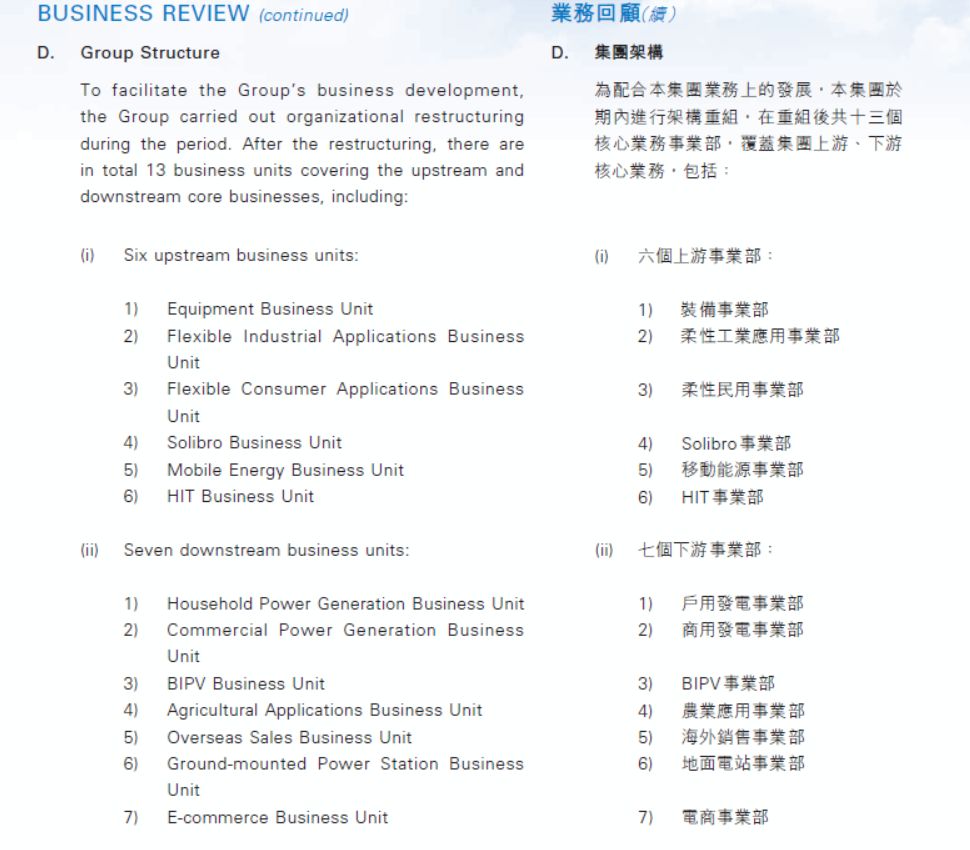 其中,上游主要从事设计和制造大规模太阳能电池生产线,提供产线集成和安装调试服务。下游则包含家用太阳能发电系统和小型工商业分布式项目;农业应用事业部以及电商事业部等。