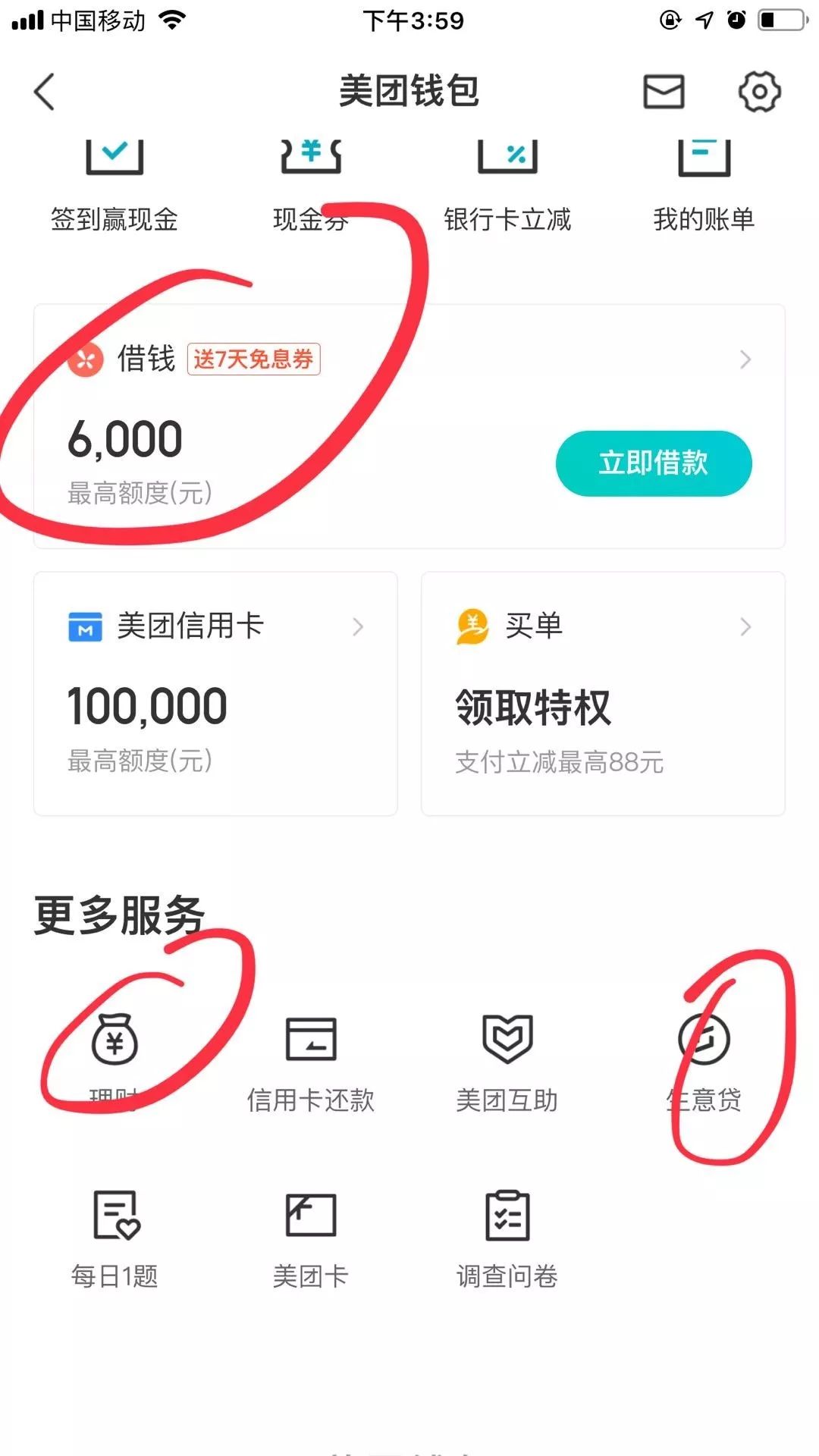 美团主要提供的金融服务有借钱、理财、信用卡、生意贷,其中生意贷最高可贷100万元,日利息最低0.03%。