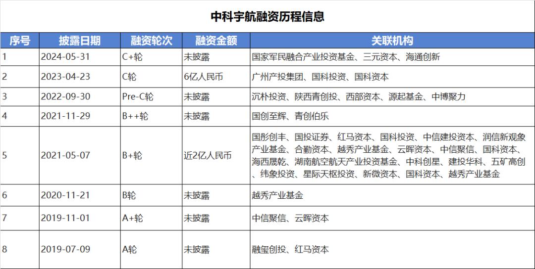 作为商业航天赛道参与者,中科宇航也在引入市场化资本。天眼查信息显示,在启动IPO前,中科宇航已经完成八轮融资,累计融资额达到10亿元,投资方包括广州产投集团、中科创星、越秀产业基金、国科资本等知名机构。