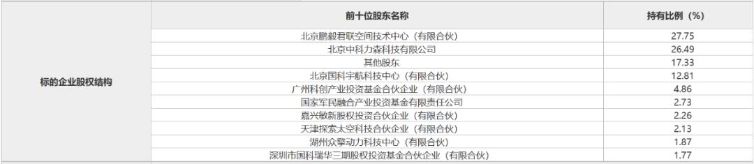 此次的转让方为北京中科力森科技有限公司,正是中科院力学研究所下属全资企业。此外,该项目转让公告也公开了中科宇航的前十大股东。其中,北京鹏毅君联空间技术中心(有限合伙)为控股股东,持股比例为27.7476%,此外,中科院下属的北京中科力森科技有限公司持股26.49%,广州科创产业投资基金持股4.86%,中信聚信持股2.26%,国科投资持股1.77%。