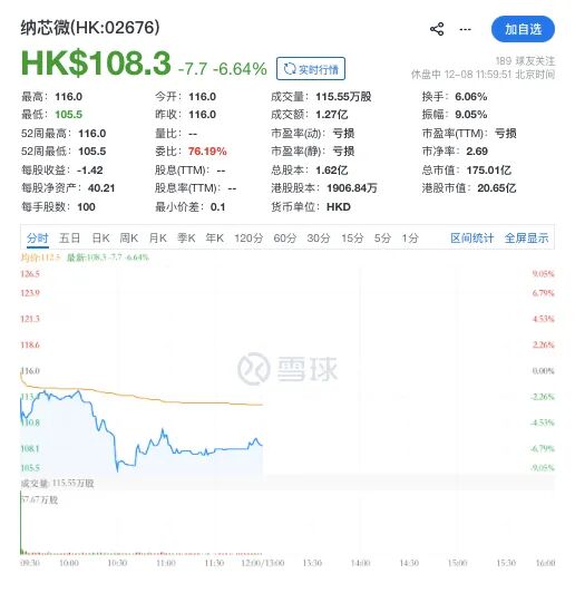 12月8日,模拟芯片设计公司苏州纳芯微电子股份有限公司(下称:纳芯微)正式在港交所主板挂牌上市,并以发行价116港元/股平开,开盘市值约187.45亿港元。截至今日午间休市,纳芯微跌6.64%报108.3港元,总市值约175.01亿港元。