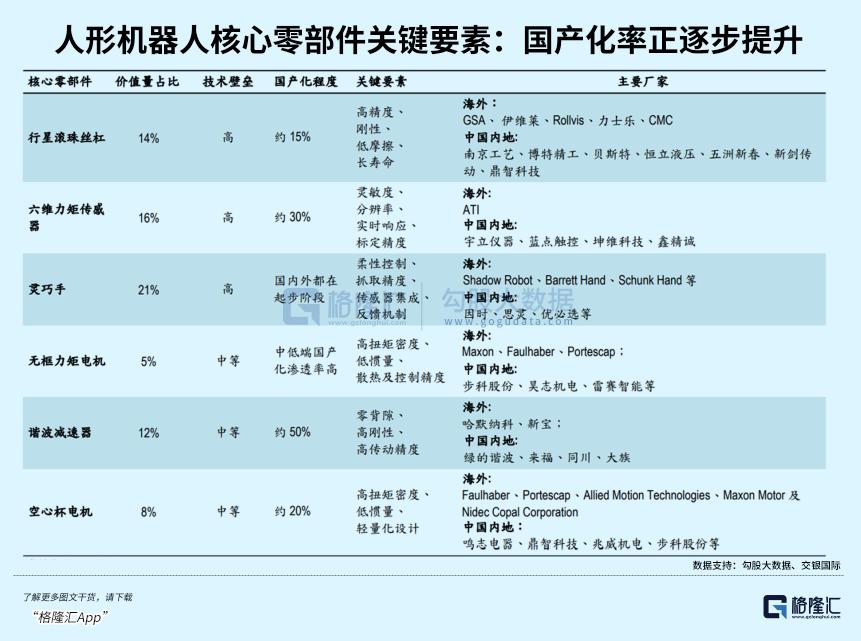 价格下探的本质源于部分核心零部件国产化率得到突破,谐波减速器(绿的谐波)、行星滚柱丝杠(五洲新春)、六维力传感器(汉威科技)等关键部件实现技术突破,国产化率超90%。叠加AI大模型驱动的软件开源生态,单机BOM(物料清单)成本大幅下降。
