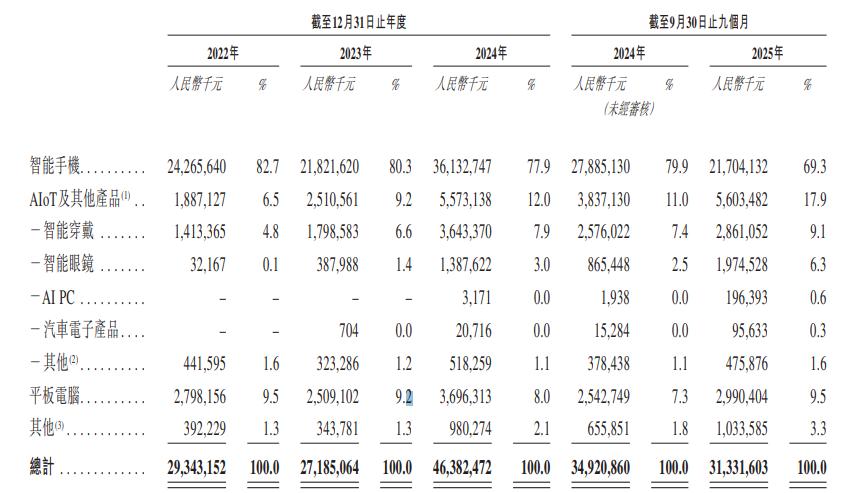 其中,智能手机是公司主要的收入来源,2022年~2024年已经2025年前9个月,相关收入分别为242.7亿元、218.2亿元、361.3亿元以及217亿元,分别占同期总收入的82.7%、80.3%、77.9%和69.3%。