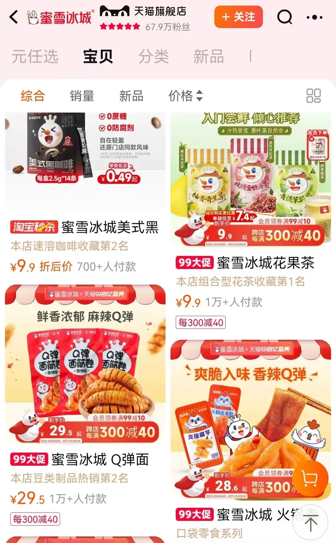 此外,蜜雪冰城、沪上阿姨等头部品牌也纷纷进军零食赛道。沪上阿姨的天猫旗舰店售卖吐司面包、威化饼、豆乳夹心包等多种零食,还有临期特价薯条等,部分产品销量过万;蜜雪冰城的天猫旗舰店则售有面筋、素毛肚、干脆面等品类,并推出了9款零食1元起任选的促销活动。