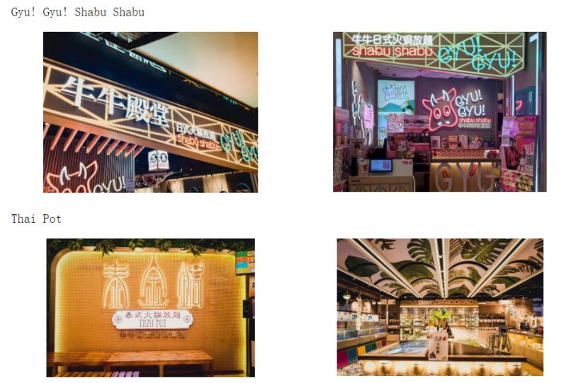 公司的火锅餐厅提供无限量自助餐,包括各种冰鲜或冷冻肉类、海鲜、蔬菜、面条、饮料,以及由厨师制作的各种热菜、甜点等,火锅汤底则包括泰式冬阴功汤、胶原蛋白猪骨汤、日本鲣鱼汤、药膳麻辣汤等。