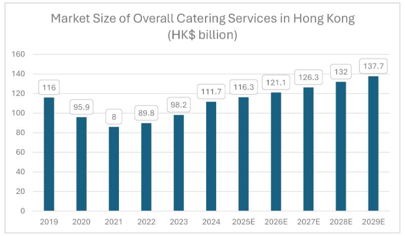 2024年香港整体餐饮服务总市场规模恢复至1117亿港元。据弗罗斯特沙利文的数据,餐饮服务行业的整体市场规模预计将以约4.3%的复合年增长率增长,预计到2029年8月将达到1377亿港元。