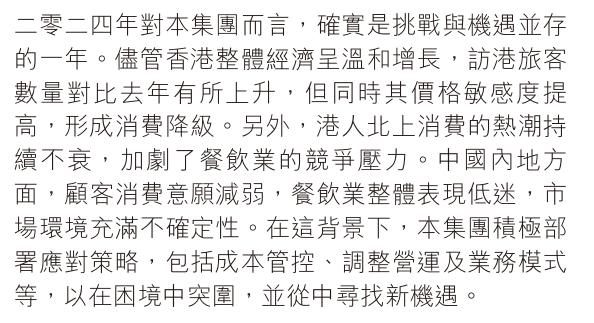 如太兴集团将业绩下滑归因于访港旅客的价格敏感度提高,消费降级成为趋势;以及港人北上消费的热潮持续不衰,加剧了餐饮业的竞争压力。